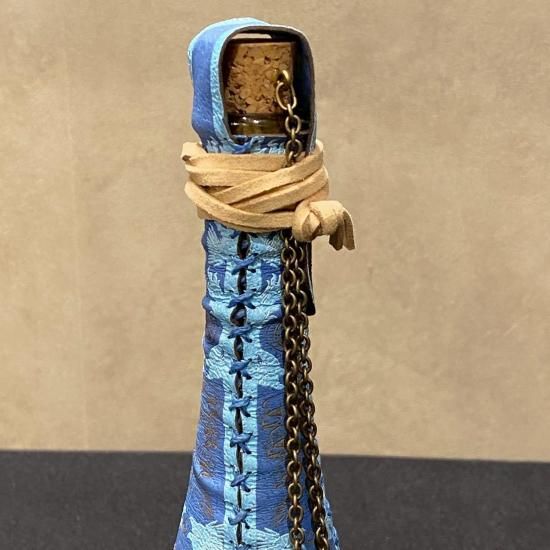 細長いガラス製のボトルに、沿うように仕立てられた本革の装飾。