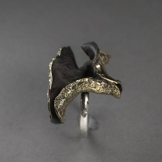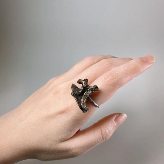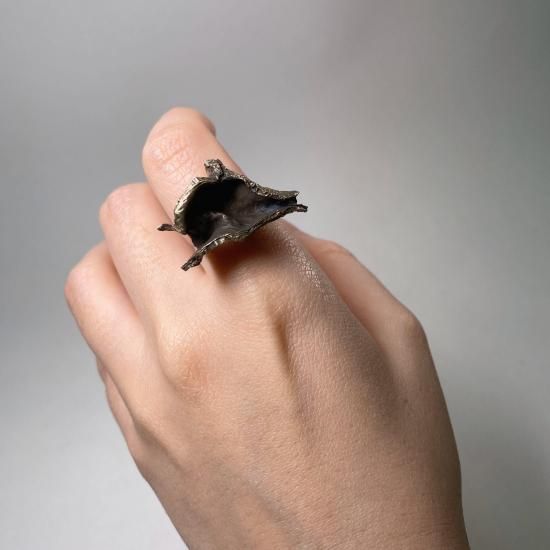 ボリュームのある乾燥キクラゲを華奢で有機的なデザインのシルバーリングにセットしたリング。