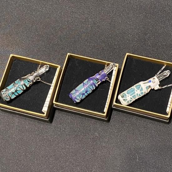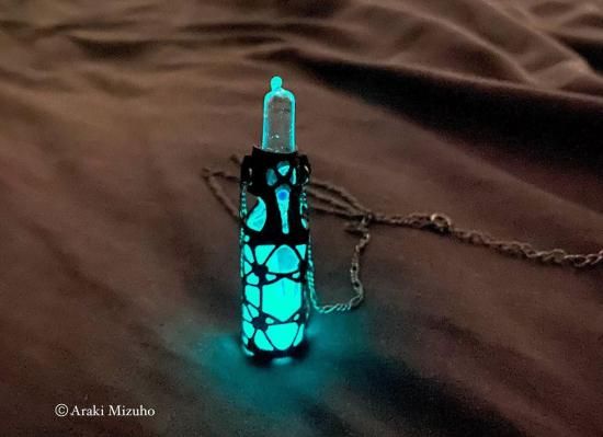 光をあてると暗闇で発光するアンプル型のネックレス。